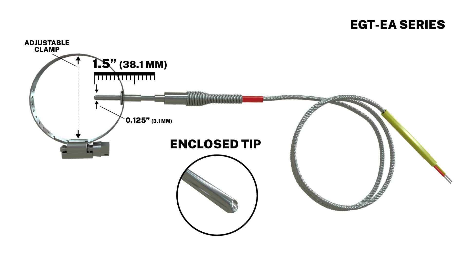 The Muffler Clamp EGT probe is designed for EGT applications that require mounting without a weld bung and compression fitting. The Muffler Clamp EGT probe is 0.125 diameter (3.18 mm) and includes an adjustable metal clamp mounting strap. The EGT probe cable lead length is 6 feet (2 meters). The probe has a 1.5" straight sheath to accommodate tight mounting locations.